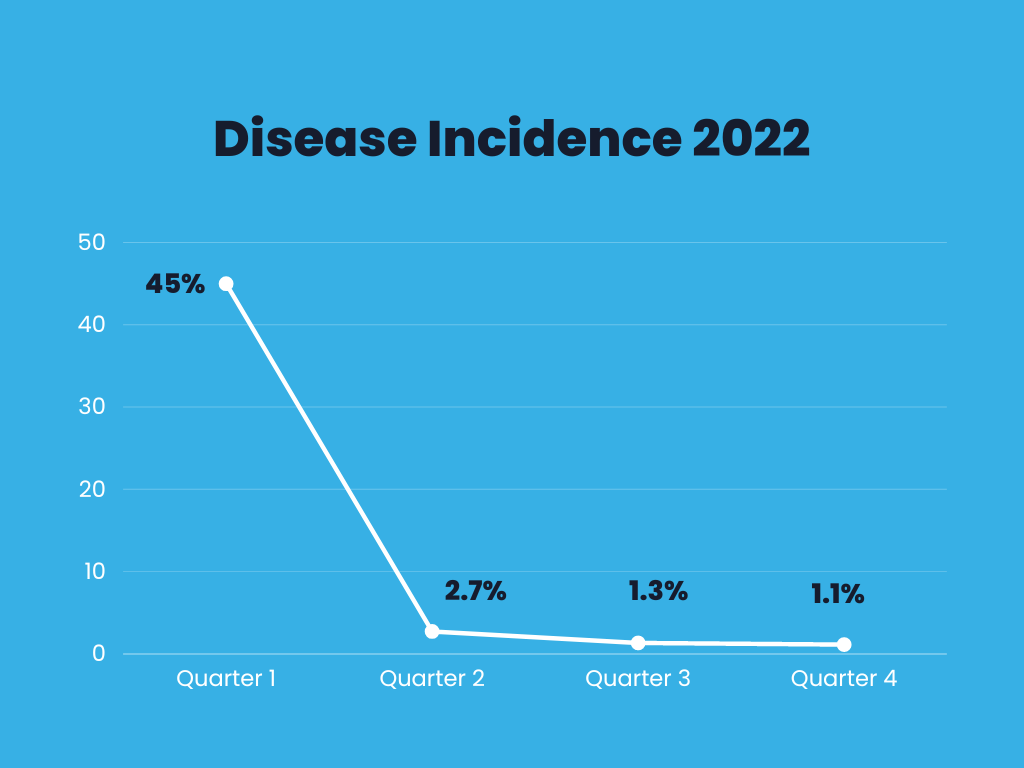 Diarrhea is a marker for all waterborne diseases. When incidences of acute diarrhea decrease, we know that so too do the rates of typhoid, dysentery and the risk of cholera. Below is a chart reflecting our data from 2022 showing a 97.5% reduction in waterborne disease incidence in the 13,537 households we partnered with.